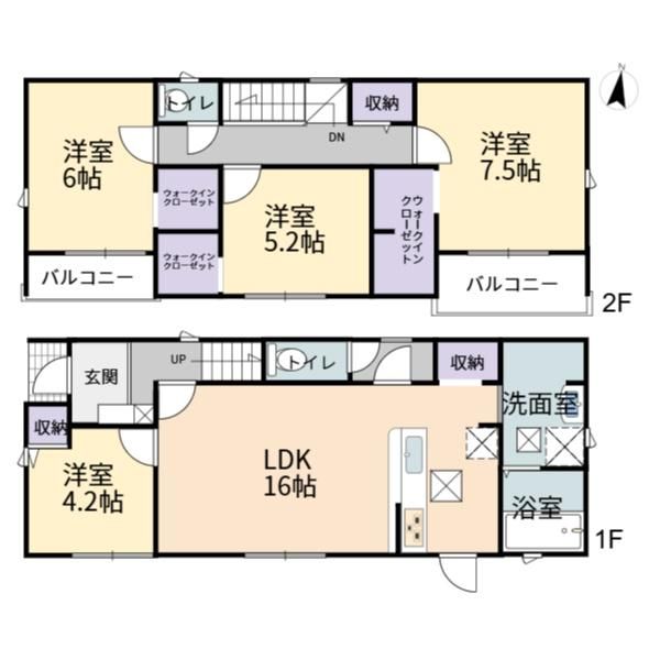 LDK16畳(1F)、洋4.2畳(1F)、洋7.5畳(2F)、洋6畳(2F)、洋5.2畳(2F) |