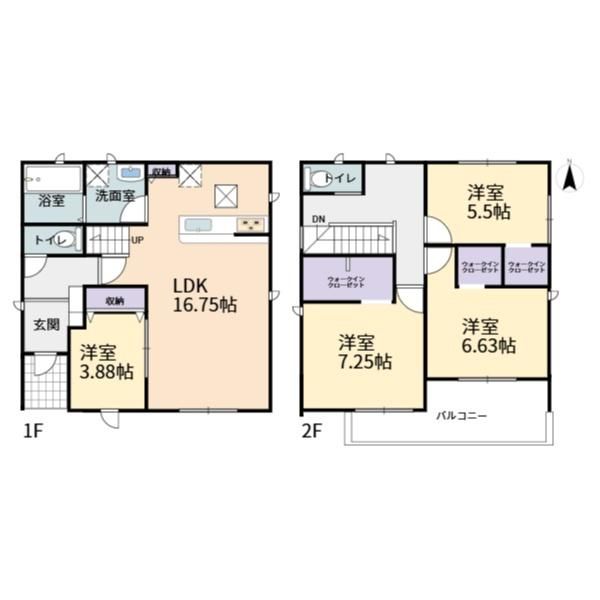 LDK16.75畳(1F)、洋3.88畳(1F)、洋7.25畳(2F)、洋6.63畳(2F)、洋5.5畳(2F) |
