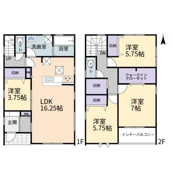 LDK16.25畳(1F)、洋3.75畳(1F)、洋7畳(2F)、洋5.75畳(2F)、洋5.75畳(2F) |