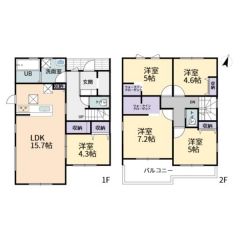 | 間取り詳細 | LDK15.7畳(1F)、洋4.3畳(1F)、洋7.2畳(2F)、洋5畳(2F)、洋5畳(2F)、洋4.6畳(2F) | 都市計画 | 非線引区域 |