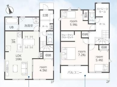 LDK16畳(1F)、洋4.5畳(1F)、洋7.2畳(2F)、洋5.9畳(2F)、洋5.4畳(2F) |