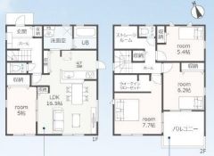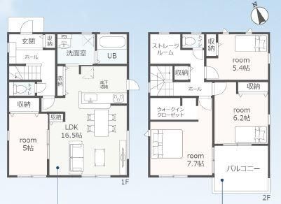 LDK16.5畳(1F)、洋5畳(1F)、洋7.7畳(2F)、洋6.2畳(2F)、洋5.4畳(2F) |