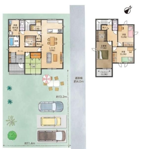 LDK18畳(1F)、和5畳(1F)、洋7.5畳(2F)、洋5.2畳(2F)、洋5.2畳(2F) |