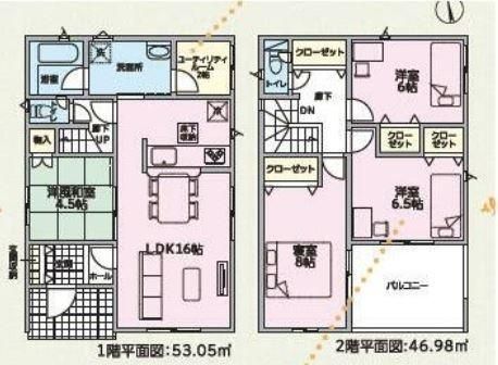 LDK16畳(1F)、和4.5畳(1F)、洋8畳(2F)、洋6.5畳(2F)、洋6畳(2F) |