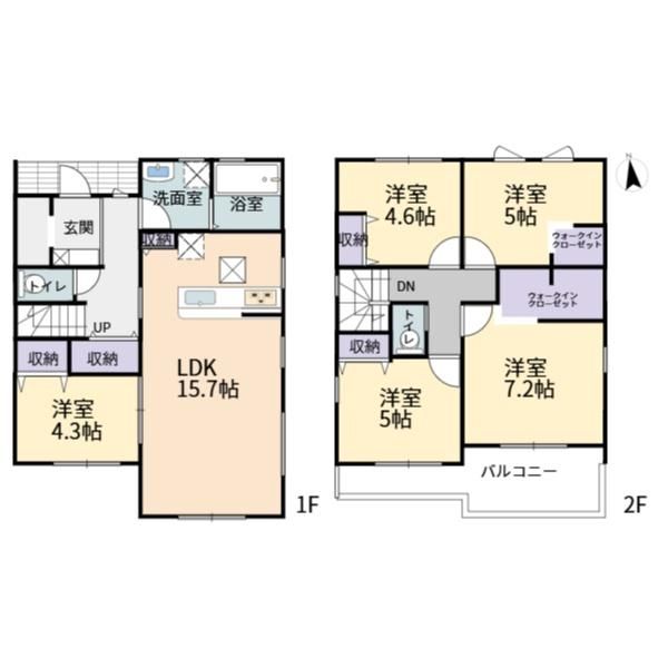 | 間取り詳細 | LDK15.7畳(1F)、洋4.3畳(1F)、洋7.2畳(2F)、洋5畳(2F)、洋5畳(2F)、洋4.6畳(2F) | 都市計画 | 非線引区域 |